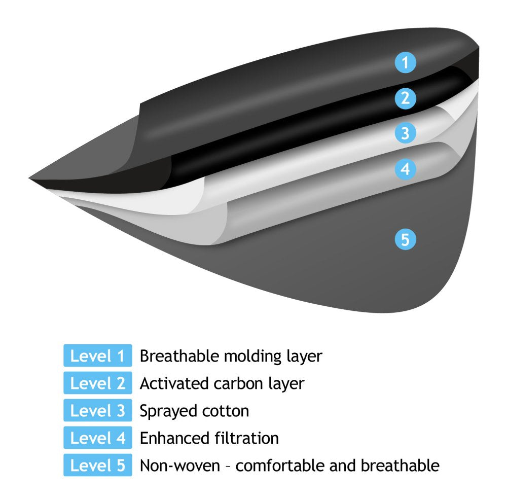 Built with 5 layers for enhanced filtration and comfort! The breathable material is flexible for long term wear, and the velcro head straps support the mask from the back of the head rather than the ears for more comfortable extended wear.