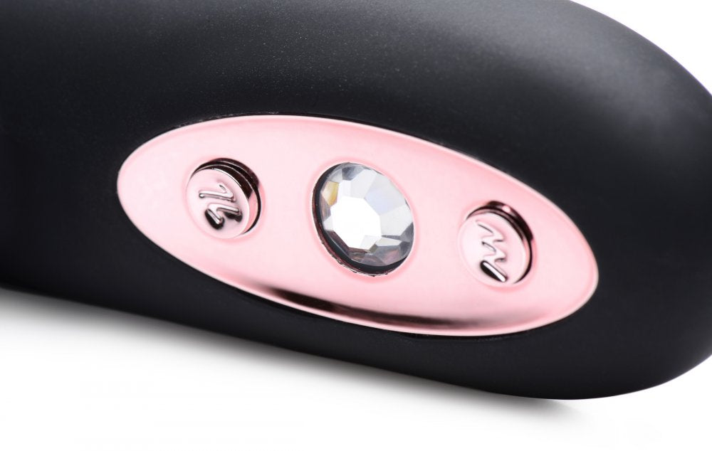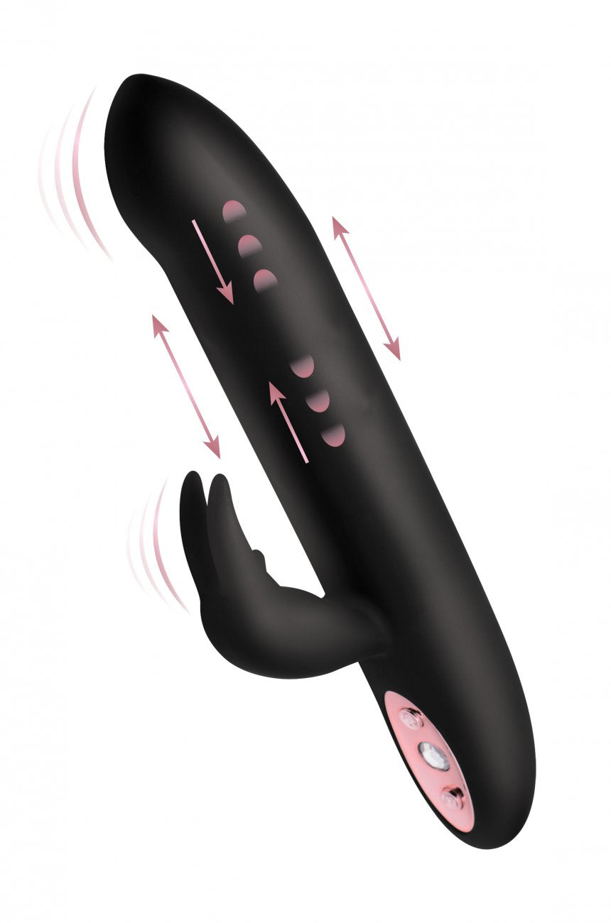 Savor the sensations from a buzzing bunny and the silky-smooth shaft as two very different sensations combine for one incredible blended orgasm. This premium silicone vibrator features 3 speeds of thrumming and 7 patterns of throbbing, as well as an ample shaft that will massage you with undulating beads and 3 vibrating speeds of its own. The elegant gem-adorned control panel is simple to use. A protruding bunny nose will pinpoint your clit for vibration, while the ears will flutter around it for an entirely different sensation. This pleasure tool is magnetically rechargeable and waterproof so that you can treat yourself in the bath or shower. The phthalate-free material is non-porous for an easy clean with mild soap or toy cleaner. Avoid use with silicone lubricants.